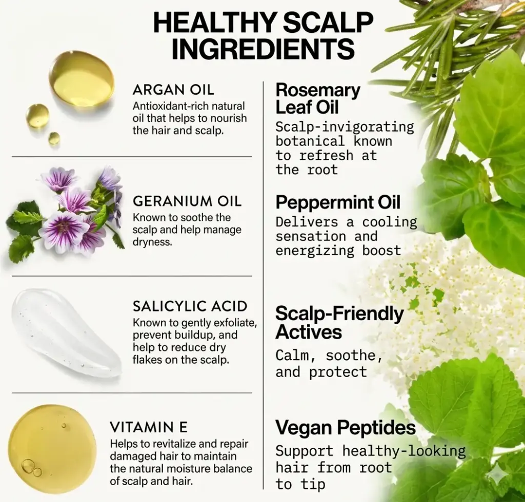 You should look for Salicylic Acid for flakes, Hyaluronic Acid for dryness, Tea Tree Oil for oil, and Peppermint to stimulate growth.