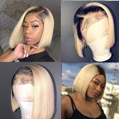 OYM Hair 13x4 Short Bob Black Ombre Blonde Lace Front Wigs Brazilian Human Hair 1B613 2 Two Tone Straight Glueless Lace Bob Wig for Black Women Pre Plucked Unprocessed Virgin Ombre 613 Wig 10"